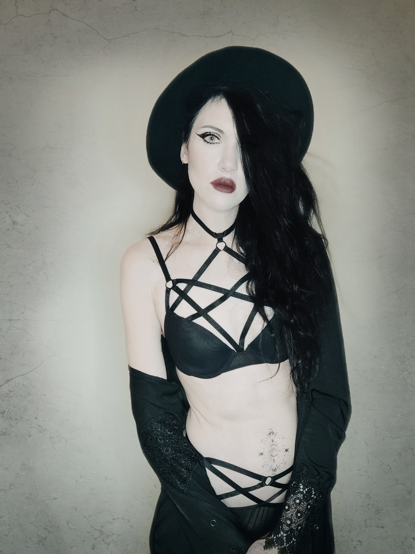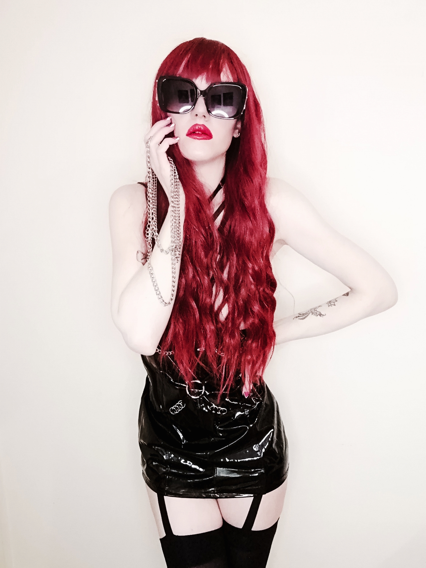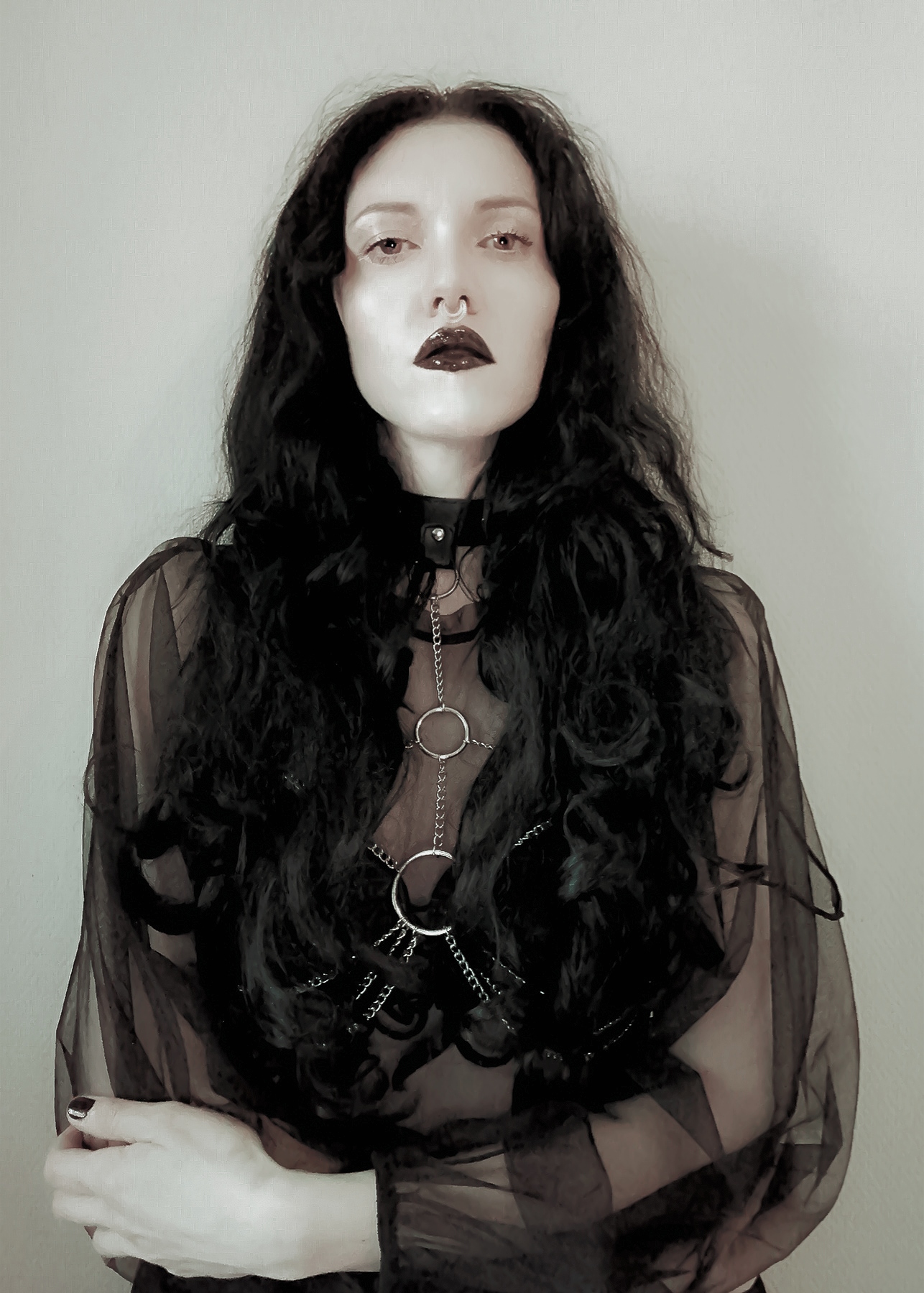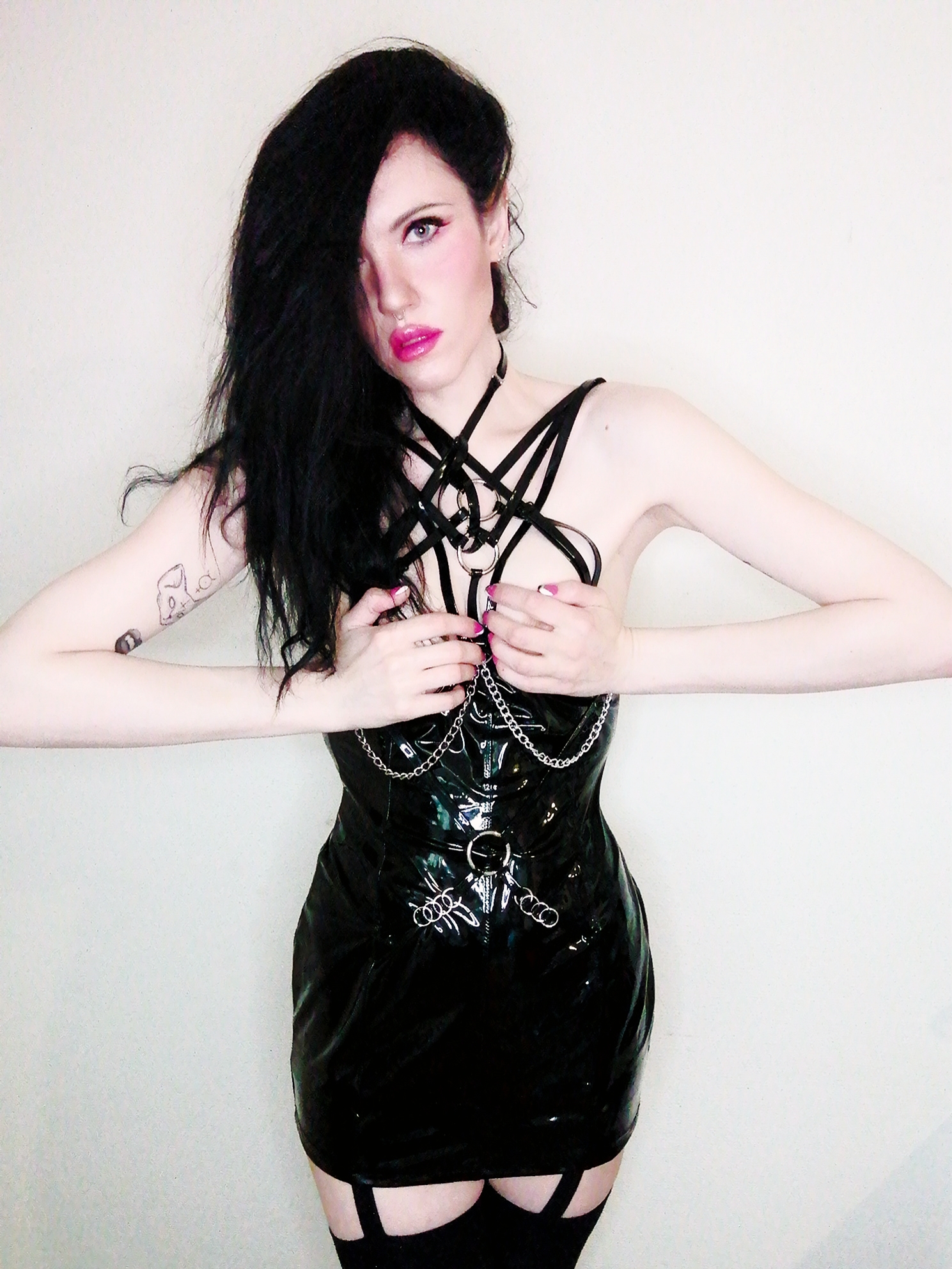 “Mistress of the night. Meet Starla”, phone photography and photo retouching apps, 2021. Harness by Little Devil’s Creations.